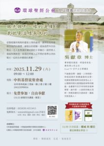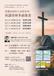 榮耀基督的生命與事奉: 再讀哥林多前後書 1/1 (四) 19:00-21:30 聖潔的身體 1/2 (五) 09:30-12:00 基..